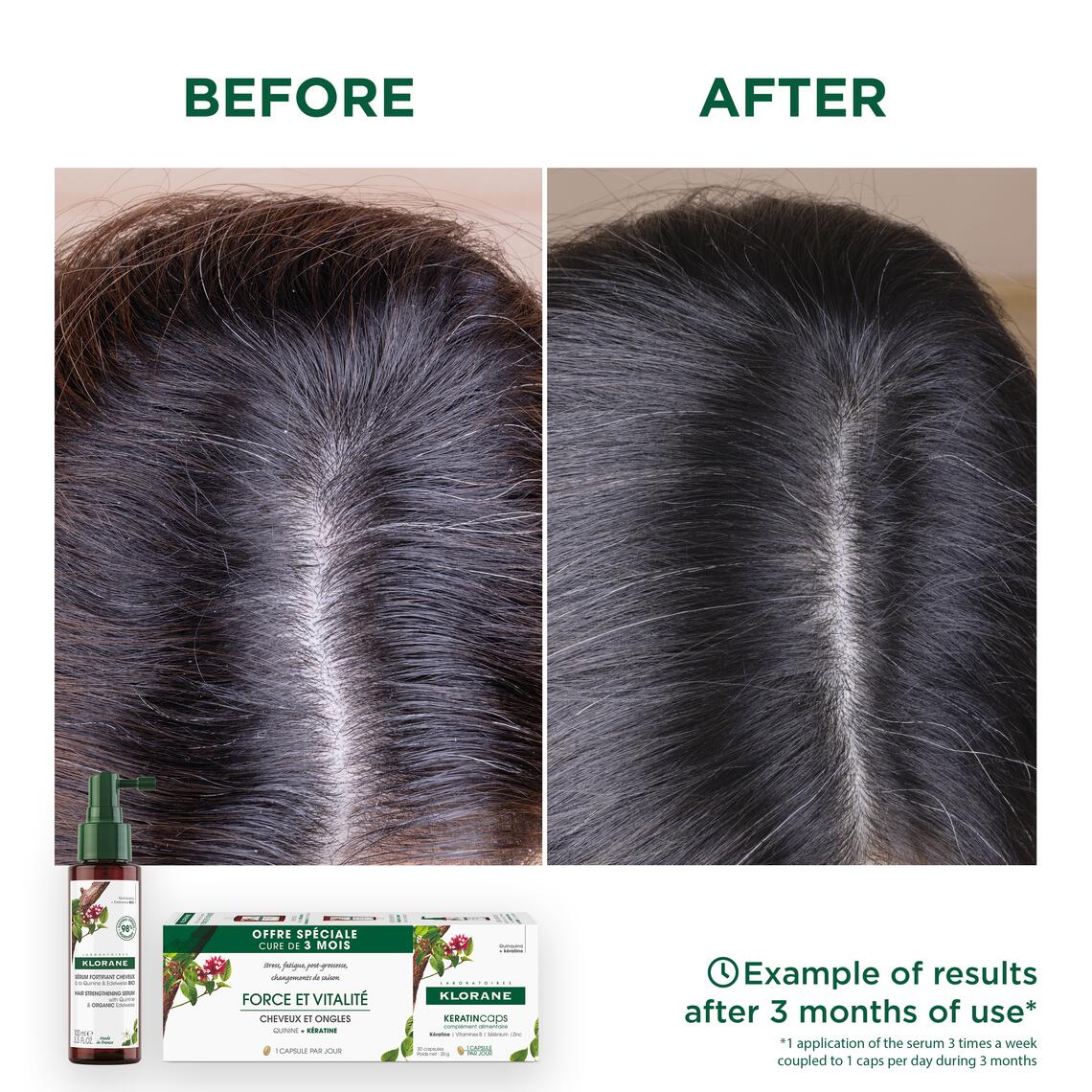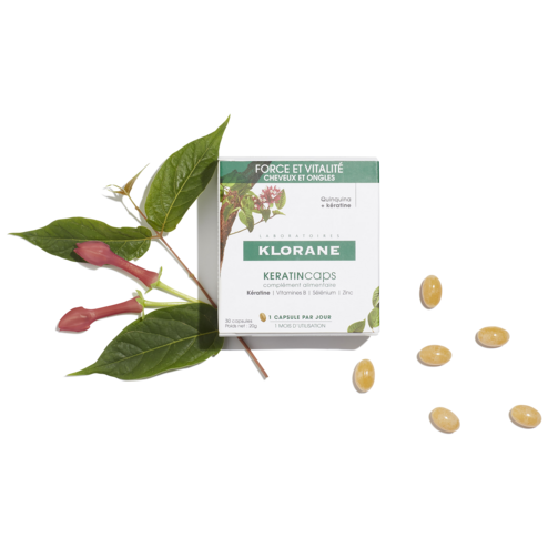 Om het haar kracht en vitaliteit te geven, hebben de Laboratoires Klorane het voedingssupplement KeratinCaps ontwikkeld, dat een complete formule bevat op basis van kinine-extract, Vitaminen B, zink, selenium en keratine. Deze micronutriënten zijn essentieel voor het behoud van gezond haar en werken van binnenuit om vermoeid haar of haaruitval te verzorgen. Om van alle voordelen te profiteren, wordt een kuur van 3 maanden aanbevolen, met één capsule per dag.