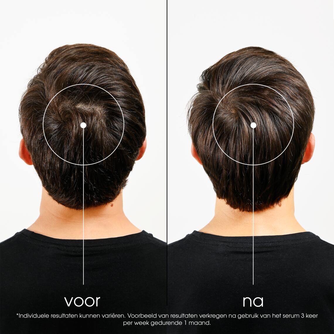 ***Gemiddelde toename van het aantal bestaande haren in de groeifase op de hele hoofdhuid. Klinische studie bij 32 personen, 3 toepassingen per week, gedurende 1 maand.
