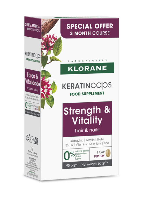 Laboratóriá Klorane vyvinuli trojmesačnú kúru doplnkov na vlasy KeratinCaps, ktoré pomáhajú obnoviť silu a vitalitu vlasov. Kapsuly obsahujú extrakt z chinínovníka, ktorý obsahuje chinín, vitamíny (B3, B6, B8 a E), zinok, selén a keratín, ktoré poskytujú základné mikroživiny, ktoré pôsobia zvnútra na zlepšenie kvality a zdravia normálnych alebo unavených vlasov počas rastu alebo vypadávania vlasov.